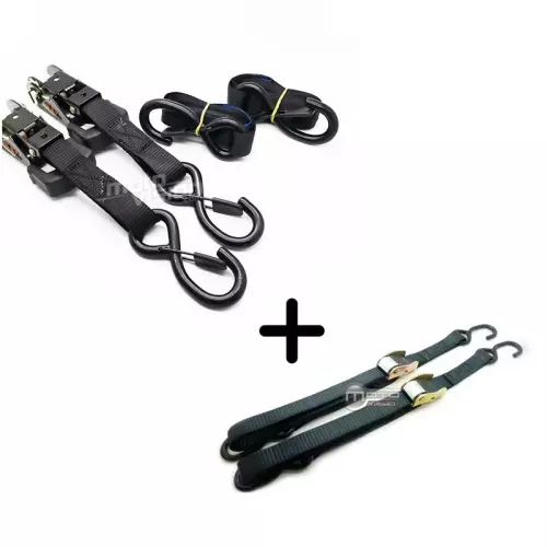 Das Joker Racing 4er-Set Motorradgurte besteht aus zwei manuellen Gurten und zwei Ratschengurten, die jeweils an den Enden mit „S“-Schnallen ausgestattet sind. Diese Schnallen ermöglichen eine schnelle und zuverlässige Befestigung an den Verzurrhaken Ihres Anhängers oder Transporters.