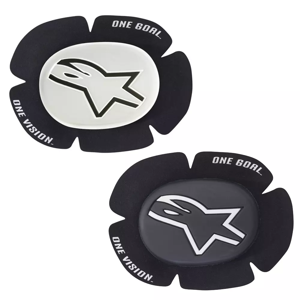 Optimieren Sie Ihre Schräglagen mit den schwarz-weißen Alpinestars Sport Sliders, die für ein flüssiges und kontrolliertes Gleiten auf dem Asphalt entwickelt wurden.