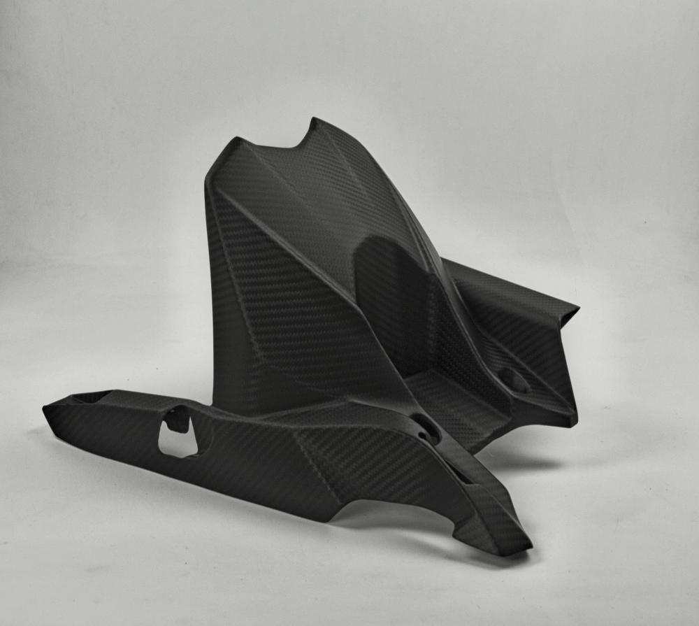Die Teile bestehen aus echtem Karbon, das aus einer äußeren Karbonschicht und zwei inneren Glasfaserschichten besteht.