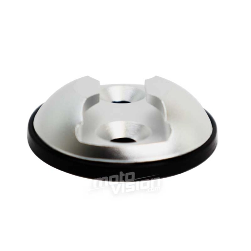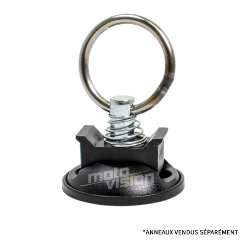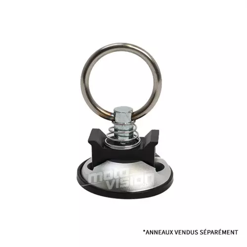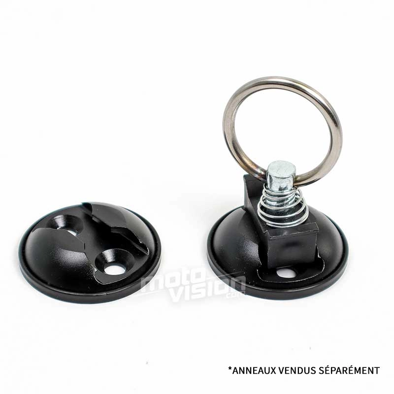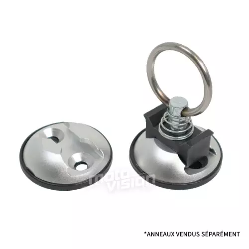 Ein Paar runder Verzurrhaken, die an die Bodenplatte eines Anhängers oder Nutzfahrzeugs geschraubt werden. Diese Vorrichtung wurde entwickelt, um einen sicheren Verankerungspunkt zu bieten, mit dem Ihr Motorrad während des Transports gesichert werden kann.
