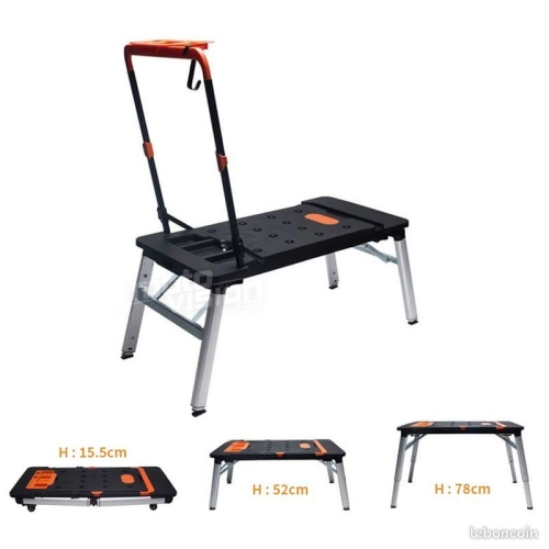 Première utilisation la semaine dernière en position marche pied : très bien , mais il ne faut pas peser 100kg ! Le plateau se déformerait Manquerait 2 roulettes pour le déplacement lorsqu'il est déplié , on est obligé de le trainer A voir a l'usage