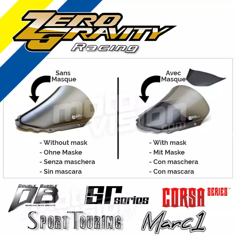 Zero Gravity ist ein amerikanisches Unternehmen mit Sitz in Kalifornien seit 1989. Es bietet jetzt eine große Auswahl an Bildschirmformen und -farben für Ihr Motorrad. Von den aerodynamischsten bis zu den farbenfrohsten gibt es immer einen Schwerelosigkeitsbildschirm, der Ihnen gefällt.