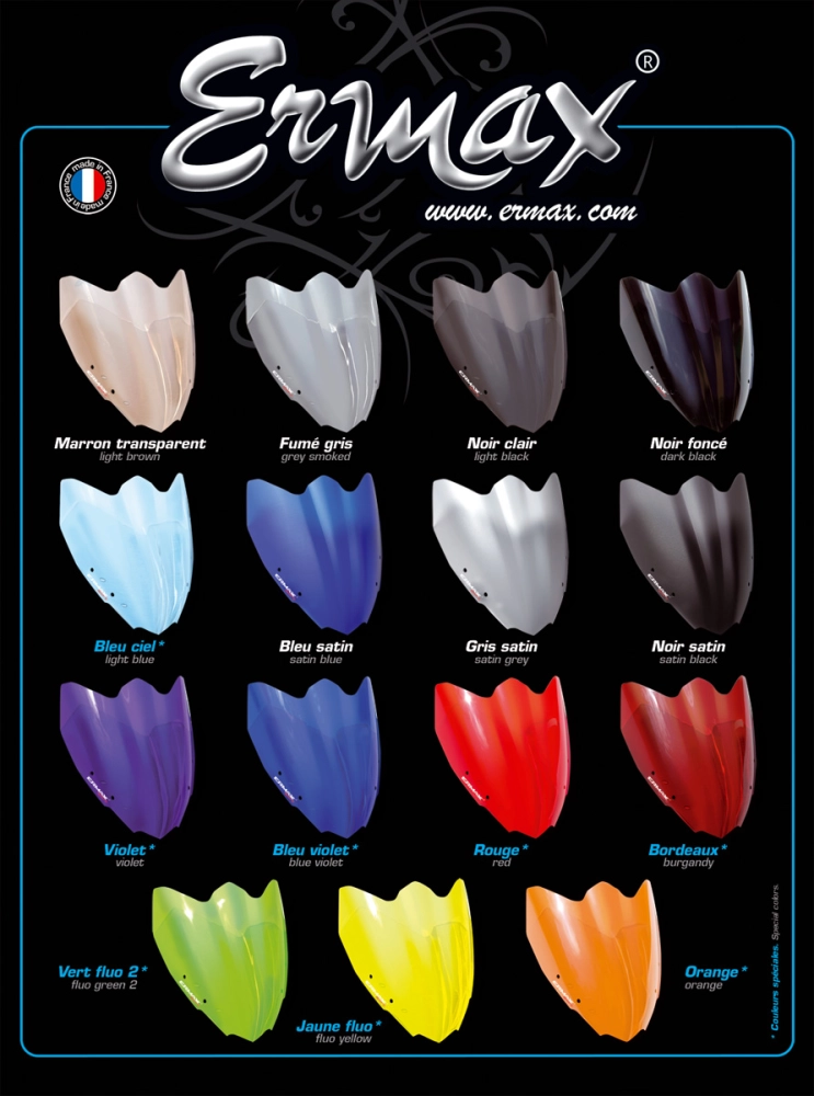 Ermax-Windschutzsheibe für Straßenmotorräder sind für Originalreifen konzipiert. Aufgrund von Fertigungstoleranzen bei Fahrzeugen, die außerhalb unserer Kontrolle liegen, kann es jedoch vorkommen, dass einige Ermax-Produkte bei der Befestigung angepasst werden müssen.