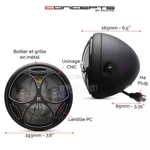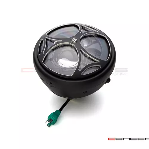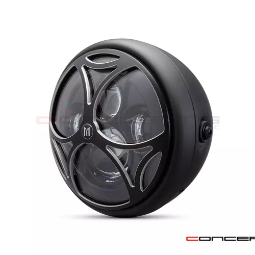 Hochwertiger und superheller Scheinwerfer im klassischen Stil mit seitlicher Montage, LED-Einsatz mit mehreren Projektoren und CNC-gefräster Titan-Grill-Designabdeckung aus Aluminium. Dieser Scheinwerfer eignet sich für pingelige Käufer, die ein Qualitätsprodukt suchen.
