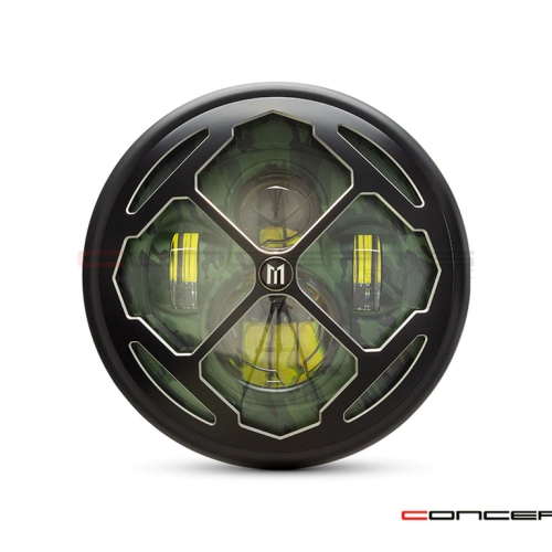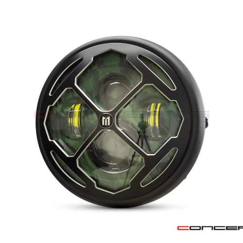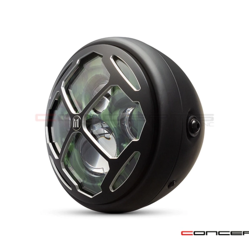 Hochwertiger und superheller Scheinwerfer im klassischen Stil mit seitlicher Montage, LED-Einsatz mit mehreren Projektoren und CNC-gefräster Titan-Grill-Designabdeckung aus Aluminium. Dieser Scheinwerfer eignet sich für pingelige Käufer, die ein Qualitätsprodukt suchen.