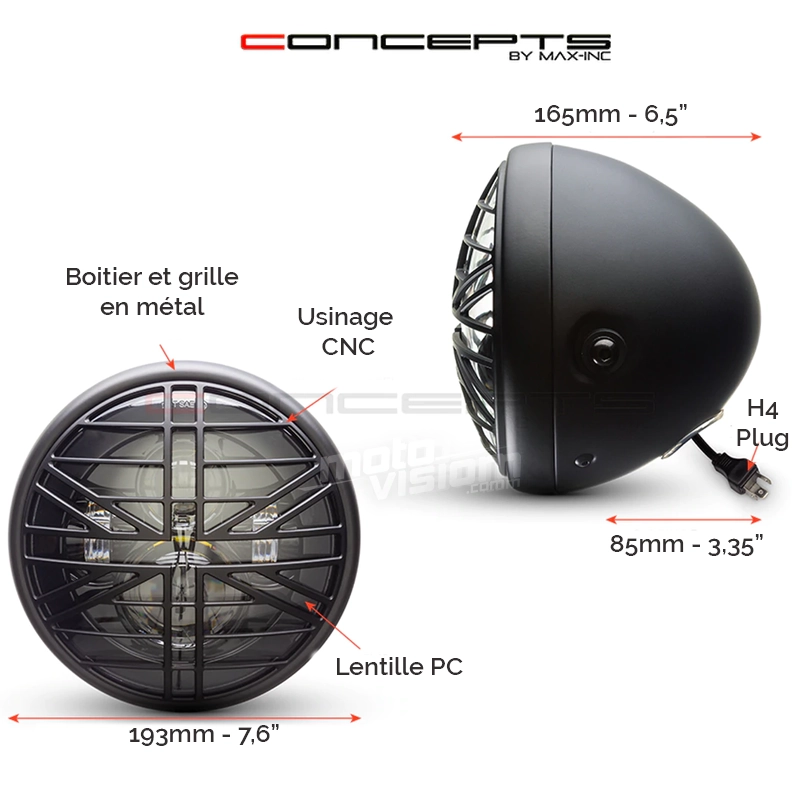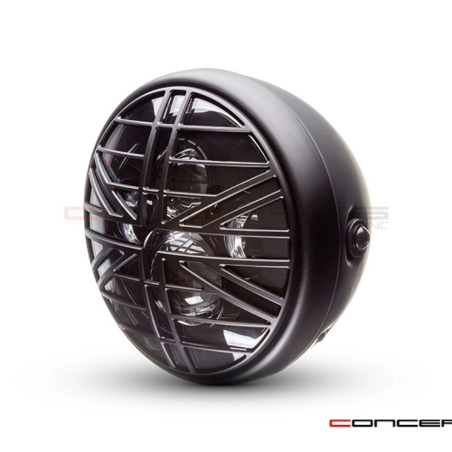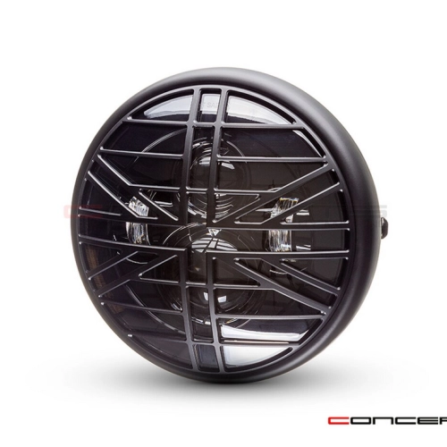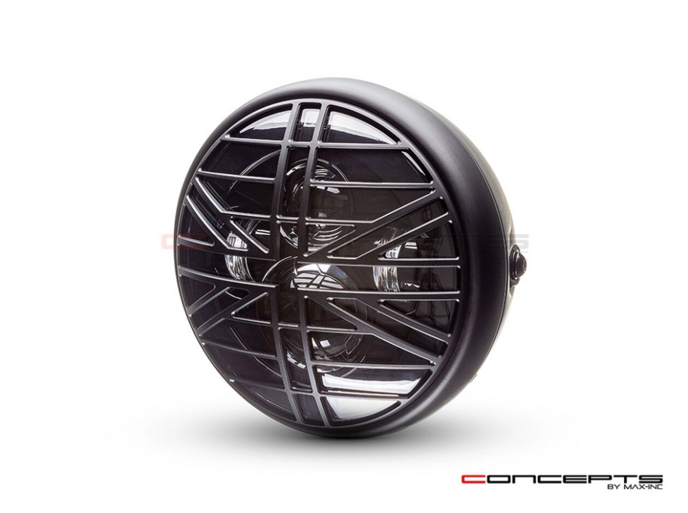 Hochwertiger und superheller Scheinwerfer im klassischen Stil mit seitlicher Montage, LED-Einsatz mit mehreren Projektoren und CNC-gefräster Titan-Grill-Designabdeckung aus Aluminium. Dieser Scheinwerfer eignet sich für pingelige Käufer, die ein Qualitätsprodukt suchen.