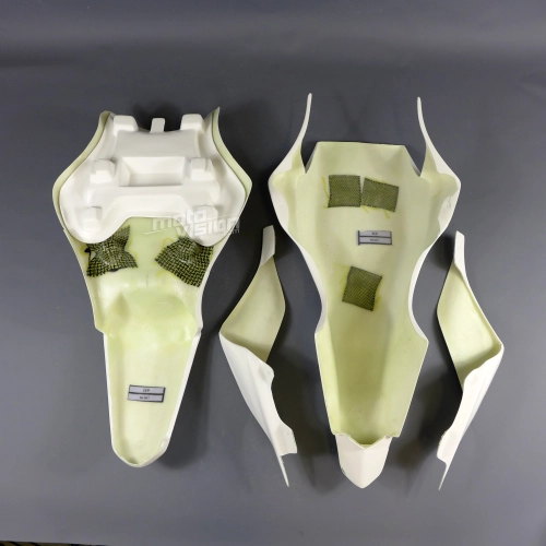 - 2 Vorschläge für die hinteren Sitzschalen: 1 komplett geschlossene Schale zum Fahren auf der Rennstrecke mit eingeklebtem Sitzschaum oder 1 Schale, die den Originalsitz für die meisten Motorräder beibehält.