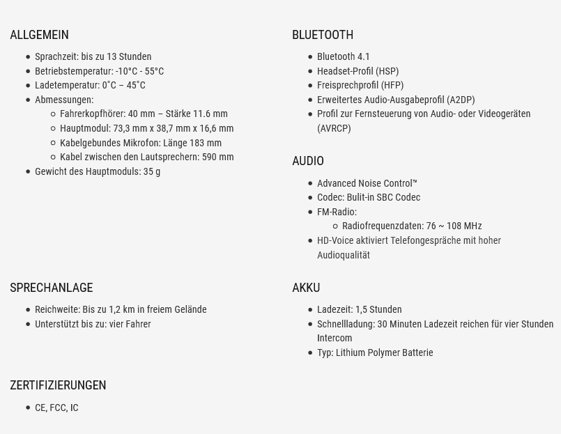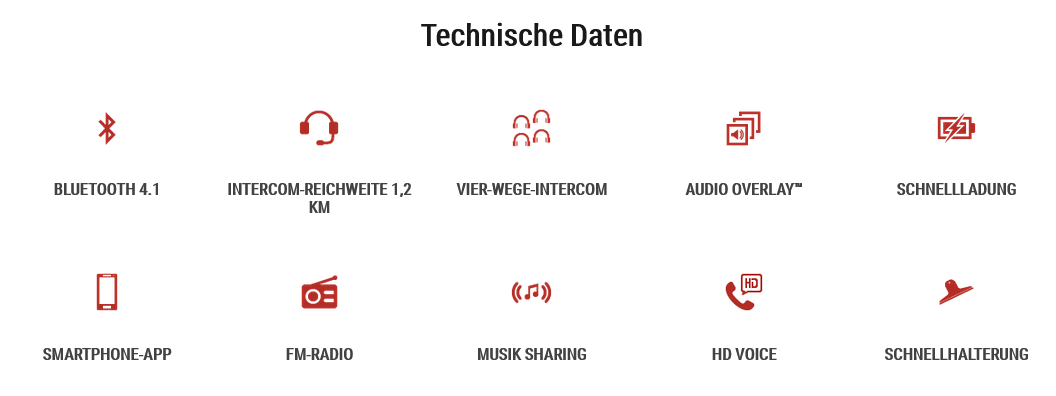 - Bluetooth 4.1 - FM-Radio - Quick attach - 1,2 km Gegensprechanlage - 4-Wege-Gegensprechanlage