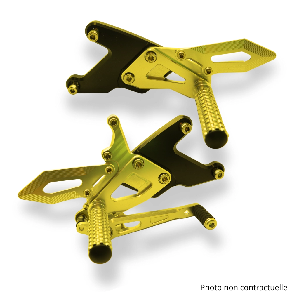 Die Verstellbar Fussrastenanlage Moto-Tron Racing Yamaha R1 2015-2021 sind ideal, um eine sportlichere und bequemere Sitzposition auf Ihrem Motorrad einzunehmen. Dieses paarweise erhältliche Zubehör ist vollständig aus dem Vollen gefräst (Alu T6 6061) und mit einer Lasermarkierung versehen. Es verleiht Ihrem Motorrad einen gepflegten Racing-Look und verbessert gleichzeitig Ihre Fahrposition entsprechend Ihrer Morphologie.