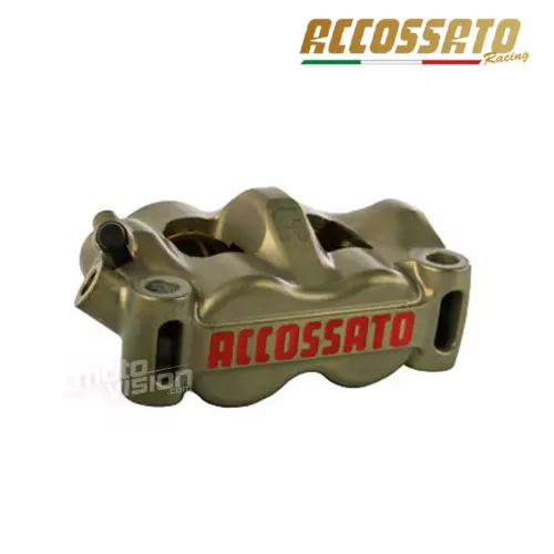 Die einteiligen Accossato Radial-Vorderradbremsen werden paarweise oder einzeln (links oder rechts) verkauft. Sie werden ohne Bremsbeläge und Staubschutzkappe geliefert. Die Bremssättel aus CNC-Aluminium sind für einen Achsabstand von 100 mm ausgelegt, mit 2+2 Titankolben (38+34 mm) und einem 30-mm-Offest.