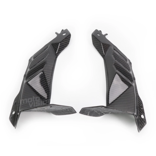 Paar Lufteinlassabdeckungen Carbon glänzend Kawasaki ZX10R 2021-, geliefert ohne Schrauben oder andere Befestigungen. Die Bohrungen sind bereits an den Motorradverkleidungen aus Carbon angebracht. Die Teile sind mit glänzendem oder mattem Lack erhältlich.