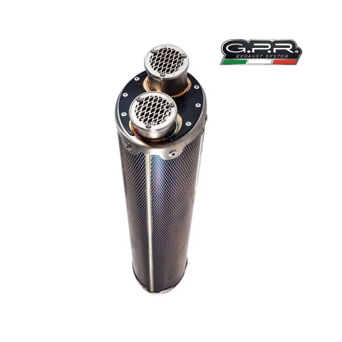 GPR hat den Dual Poppy exklusiv für Enduro- und Grand-Touring-Bikes entwickelt. Es besteht aus Edelstahl 304 mit Carbon-Look-Finish und zwei Auslässen. Es hat eine elliptische Form mit den Maßen 100 mm x 130 mm. Dieses Kit enthält das spezielle Lnik-Rohr oder den Halbverteiler mit den entsprechenden Halterungen und Zubehör. Dies ermöglicht eine Installation ohne strukturelle änderungen. Dies ist ein Original-GPR-Produkt, das auf der Grundlage der Erfahrungen von GPR in der Weltmeisterschaft entwickelt wurde. Es bietet ein innovatives Design, verbesserte Leistung, Gewichtseinsparungen und einen satten Klang. Gewicht: 1,8 kg