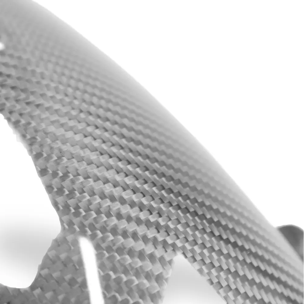 Leicht erkennbar an seiner sehr feinen und dichten Webart, die für eine gute Stoßfestigkeit sorgt. Die Folie wird dann mit einem wärmehärtenden Polymerharz in eine Form gebracht. Beim Trocknen nimmt das Carbon seine endgültige Form an und das ästhetische Ergebnis ist mit seinem schrägen Linienspiel sehr beliebt.