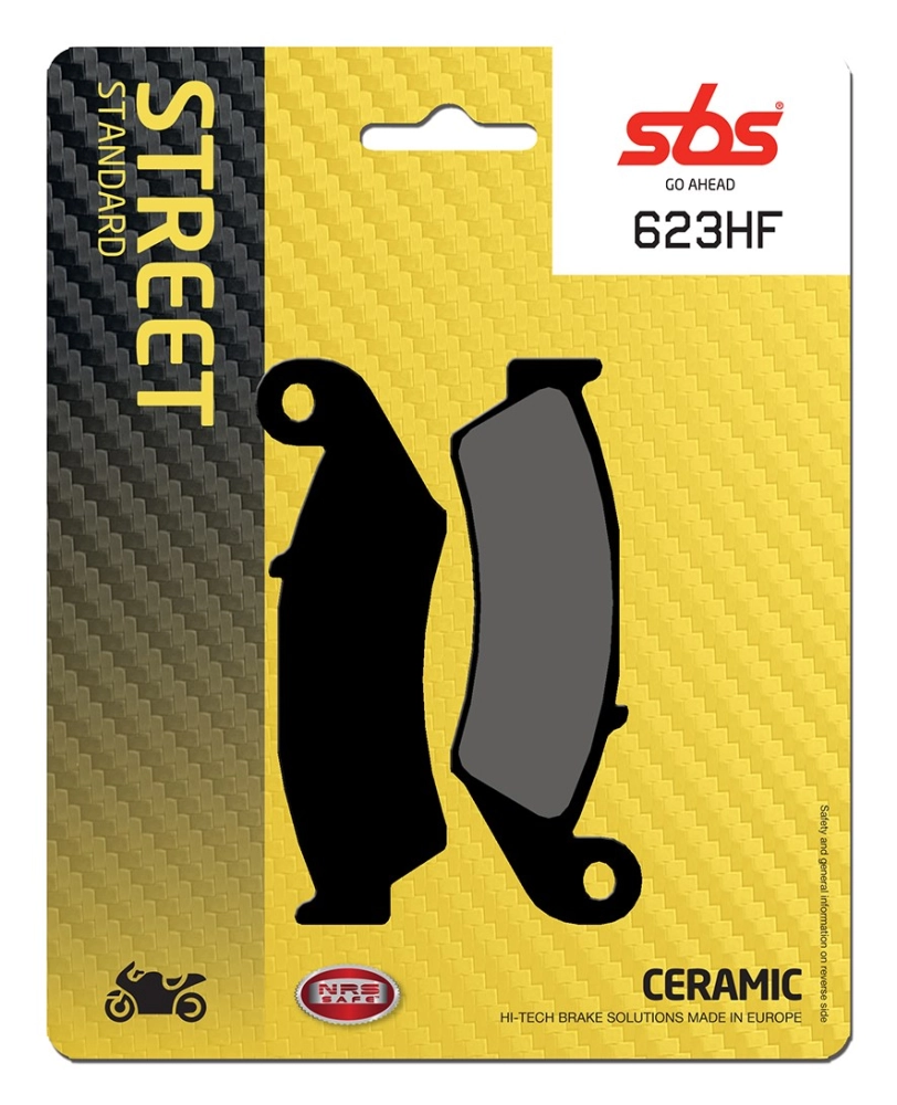 Paar Bremsbeläge SBS 623HF aus der Street Organique Reihe, ideal als Ersatz für Ihre Originalbremsbeläge, um eine stabile Bremswirkung, hohen Komfort, lange Lebensdauer und Schutz der Bremsscheiben unter nassen und trockenen Bedingungen für Motorräder und Roller zu erzielen.