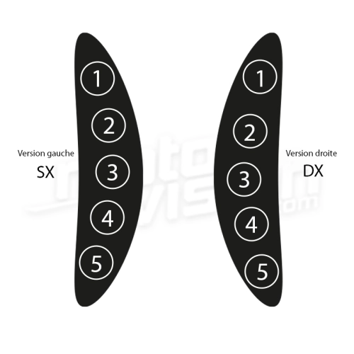 Auf Moto Vision sind drei verschiedene Lenkerschalter aus Aluminium mit Accossato-Schliff erhältlich: 2, 3 oder 5 Knöpfe. Bitte geben Sie im entsprechenden Abschnitt Ihre Wahl für jede Nummer an: den Typ des Knopfes (Ein/Aus-Druckknopf oder Momentan-Druckknopf) + seine Farbe.