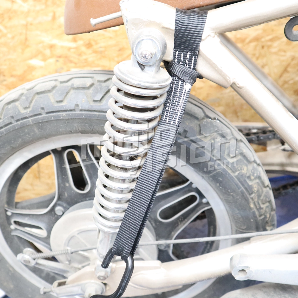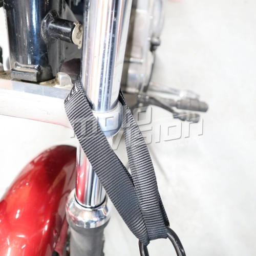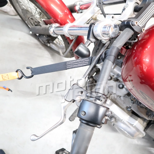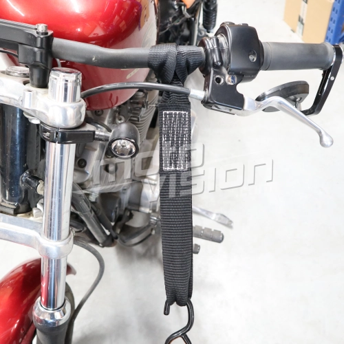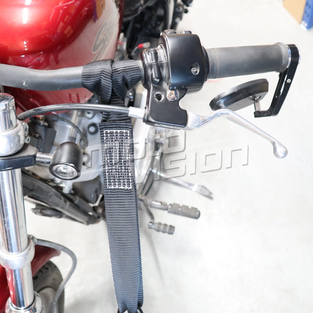 Der Gurt wird über den Lenker oder eine Stelle des Rahmens gezogen, dann können Sie einen Gurt mit Haken (separat erhältlich) durchziehen, um Ihr Motorrad zu spannen und zu sichern.