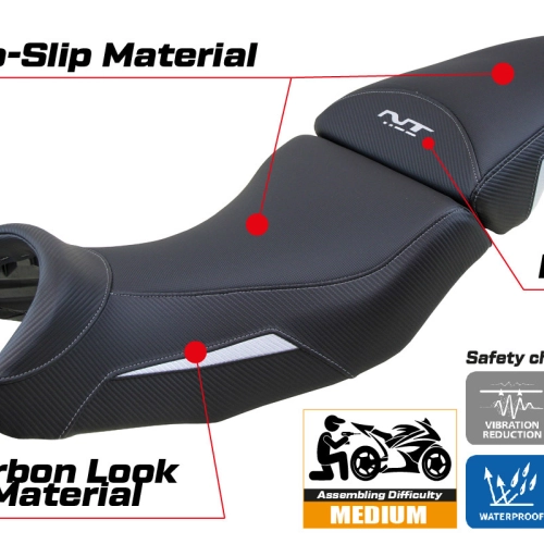 - Comfort system: Dieser Bezug ist außen exakt identisch mit allen anderen Bezügen, ist aber innen mit einer speziellen 2,5 cm dicken Schicht aus Memory-Schaumstoff gekoppelt. Tappezzeria Italia ist der einzige Hersteller, der die Memory Foam-Technologie verwendet, die den Fahrkomfort verbessert, indem sie Ermüdungserscheinungen und Vibrationen des Motorrads verringert.