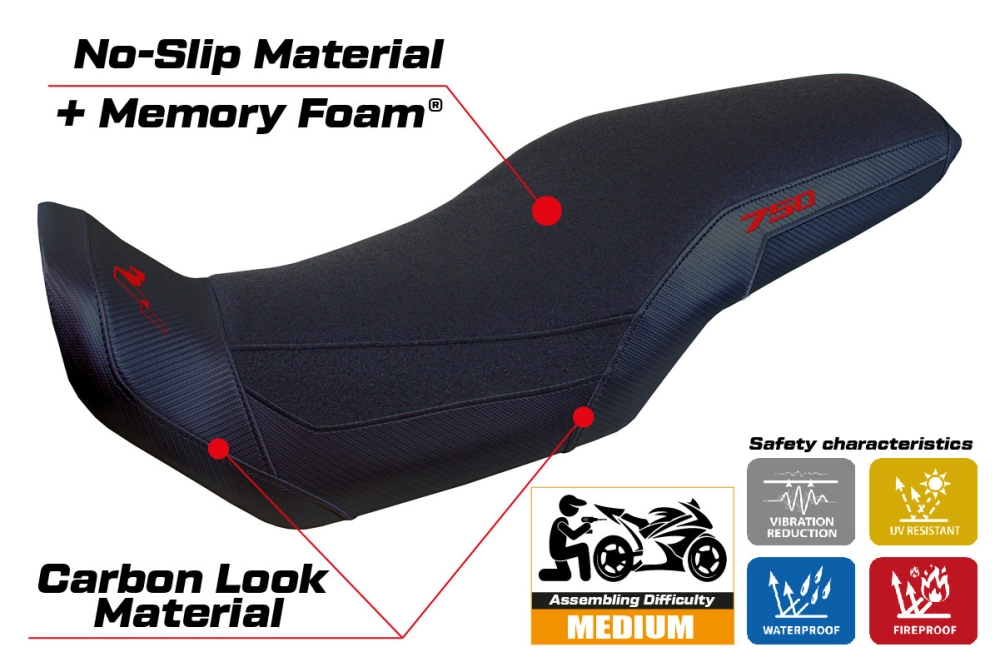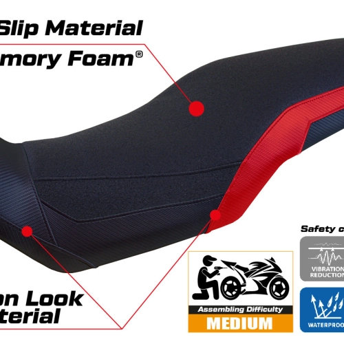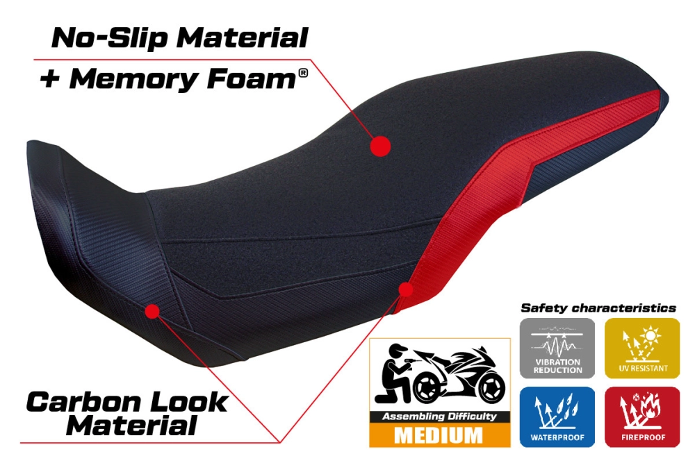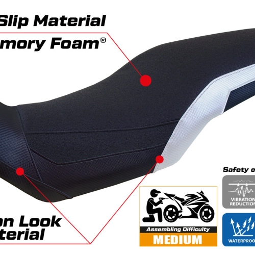 - Comfort system: Dieser Bezug ist außen exakt identisch mit allen anderen Bezügen, ist aber innen mit einer speziellen 2,5 cm dicken Schicht aus Memory-Schaumstoff gekoppelt. Tappezzeria Italia ist der einzige Hersteller, der die Memory Foam-Technologie verwendet, die den Fahrkomfort verbessert, indem sie Ermüdungserscheinungen und Vibrationen des Motorrads verringert.