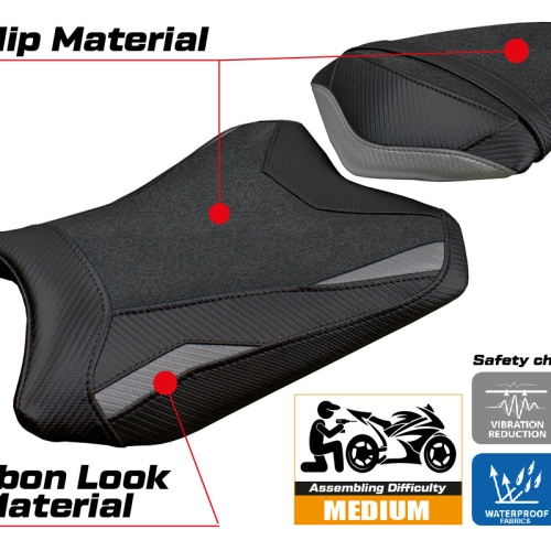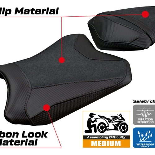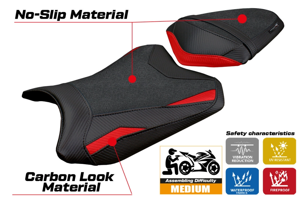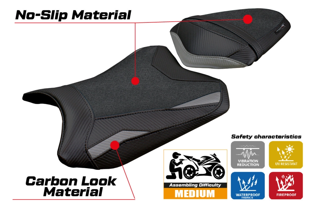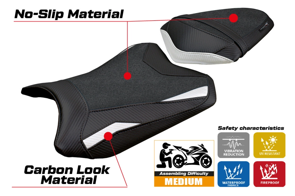 - Comfort system: Dieser Bezug ist außen exakt identisch mit allen anderen Bezügen, ist aber innen mit einer speziellen 2,5 cm dicken Schicht aus Memory-Schaumstoff gekoppelt. Tappezzeria Italia ist der einzige Hersteller, der die Memory Foam-Technologie verwendet, die den Fahrkomfort verbessert, indem sie Ermüdungserscheinungen und Vibrationen des Motorrads verringert.