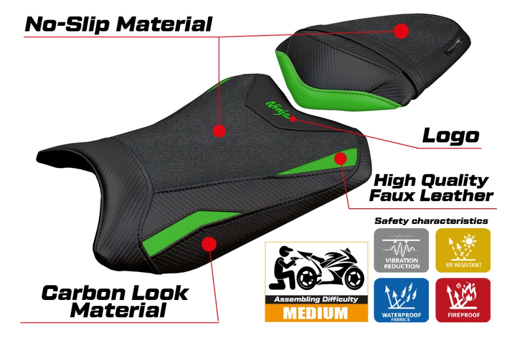Der Sitzbezug Tappezzeria KAWASAKI NINJA 300 (13-17) modele Aliko ultragrip ermöglicht es Ihnen, die Ästhetik Ihres ursprünglichen Motorradsitzes einfach zu ändern. Er verfügt über die wichtigsten technischen Eigenschaften eines hochwertigen Motorradsitzbezugs: wasserdicht und sonnenbeständig, verstärkte Nähte mit Doppelnähten und eine hohe Chemikalienbeständigkeit.