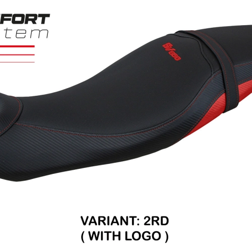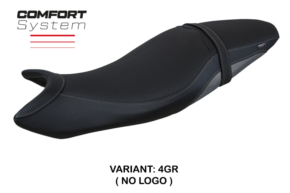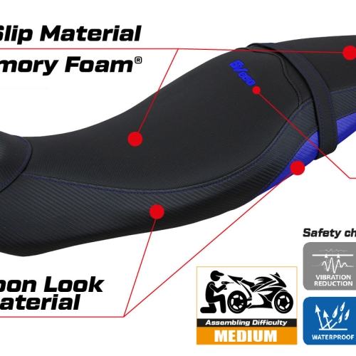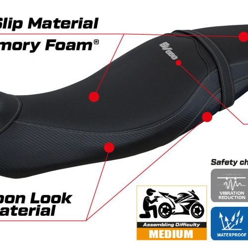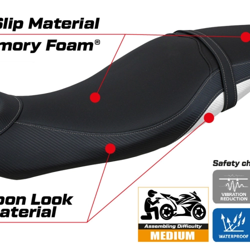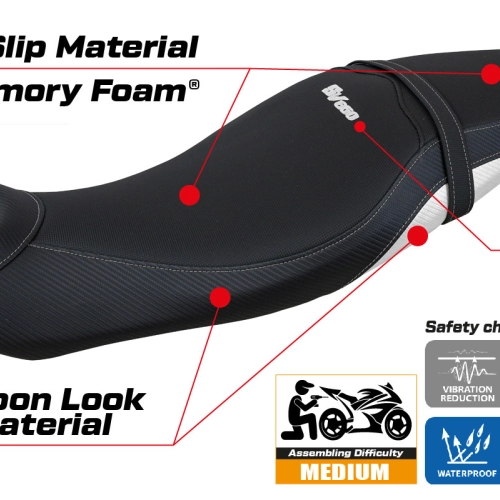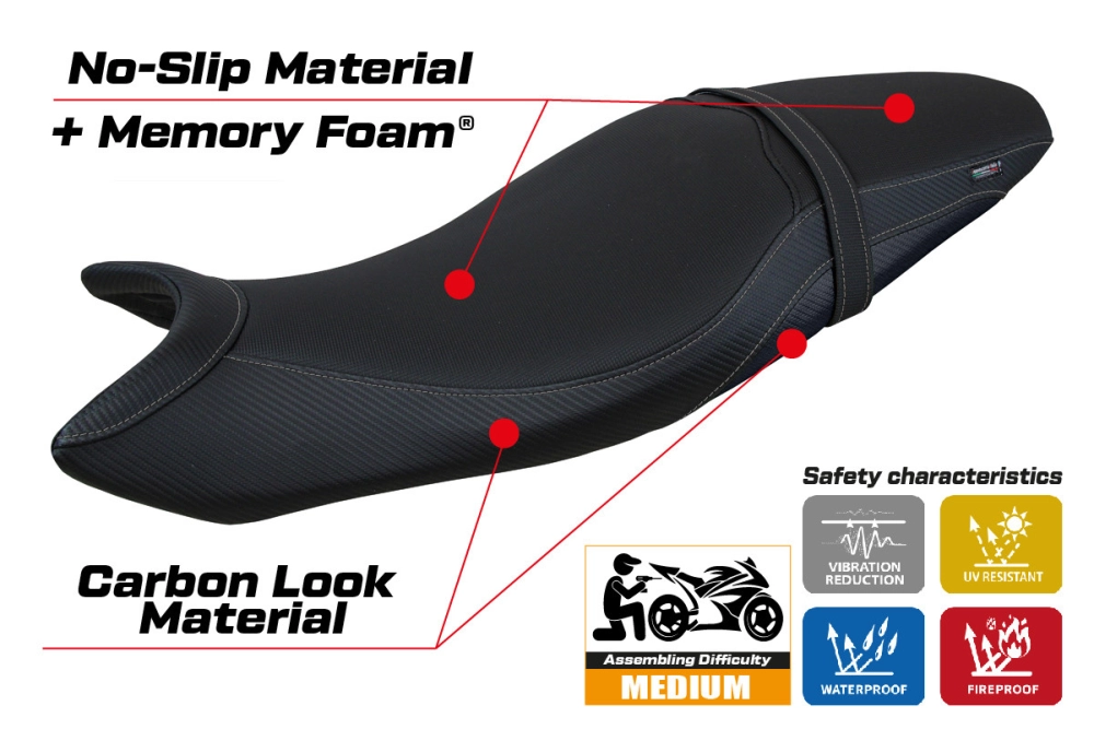 - Comfort system: Dieser Bezug ist außen exakt identisch mit allen anderen Bezügen, ist aber innen mit einer speziellen 2,5 cm dicken Schicht aus Memory-Schaumstoff gekoppelt. Tappezzeria Italia ist der einzige Hersteller, der die Memory Foam-Technologie verwendet, die den Fahrkomfort verbessert, indem sie Ermüdungserscheinungen und Vibrationen des Motorrads verringert.