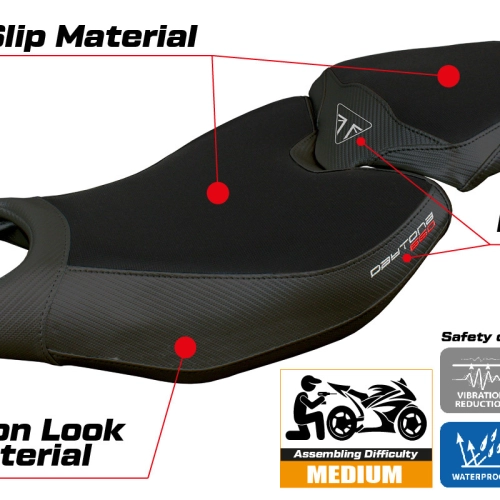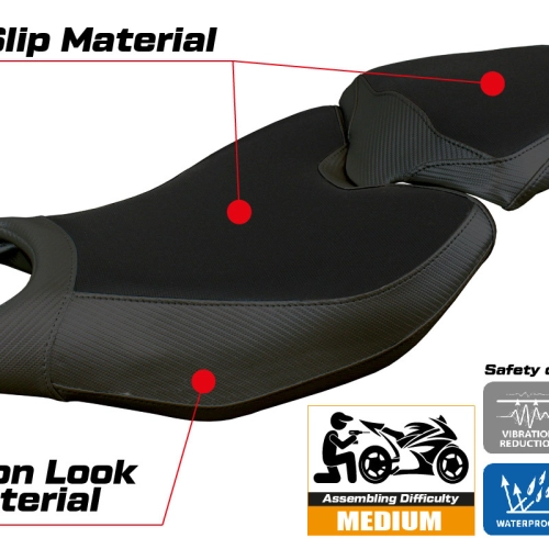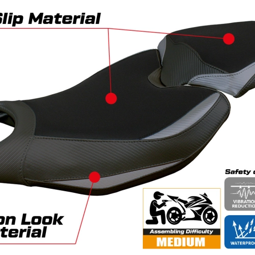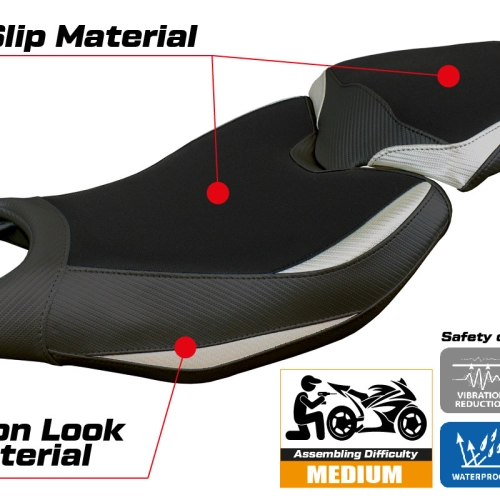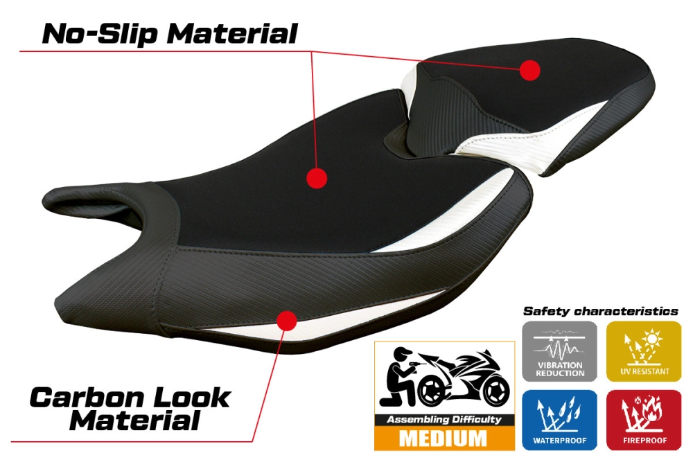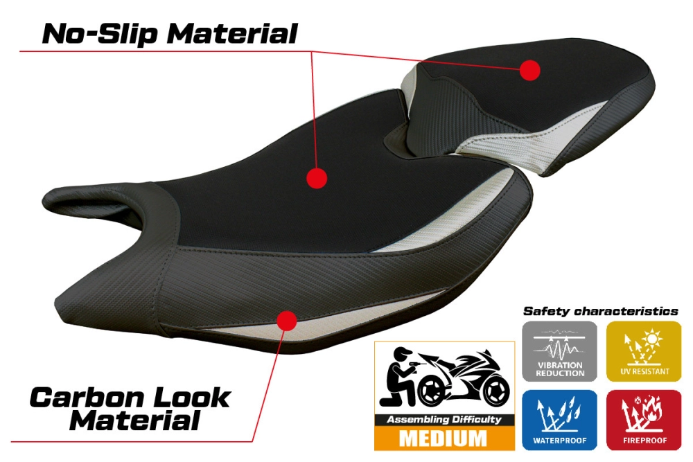- Comfort system: Dieser Bezug ist außen exakt identisch mit allen anderen Bezügen, ist aber innen mit einer speziellen 2,5 cm dicken Schicht aus Memory-Schaumstoff gekoppelt. Tappezzeria Italia ist der einzige Hersteller, der die Memory Foam-Technologie verwendet, die den Fahrkomfort verbessert, indem sie Ermüdungserscheinungen und Vibrationen des Motorrads verringert.