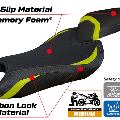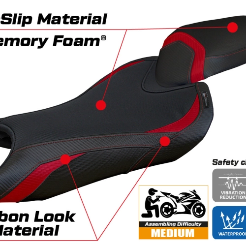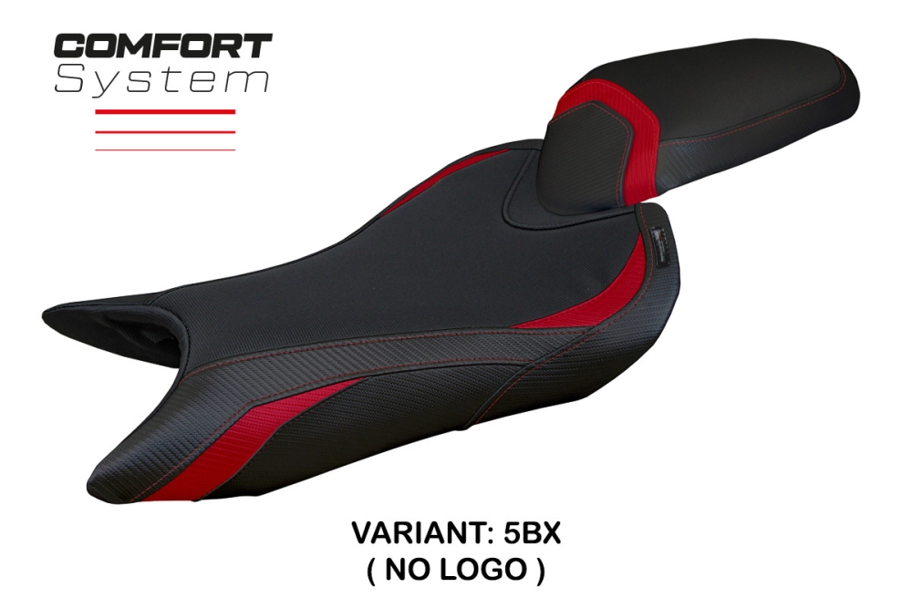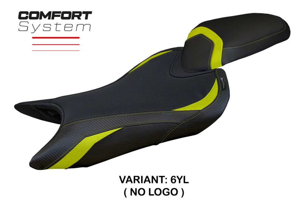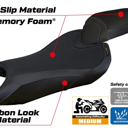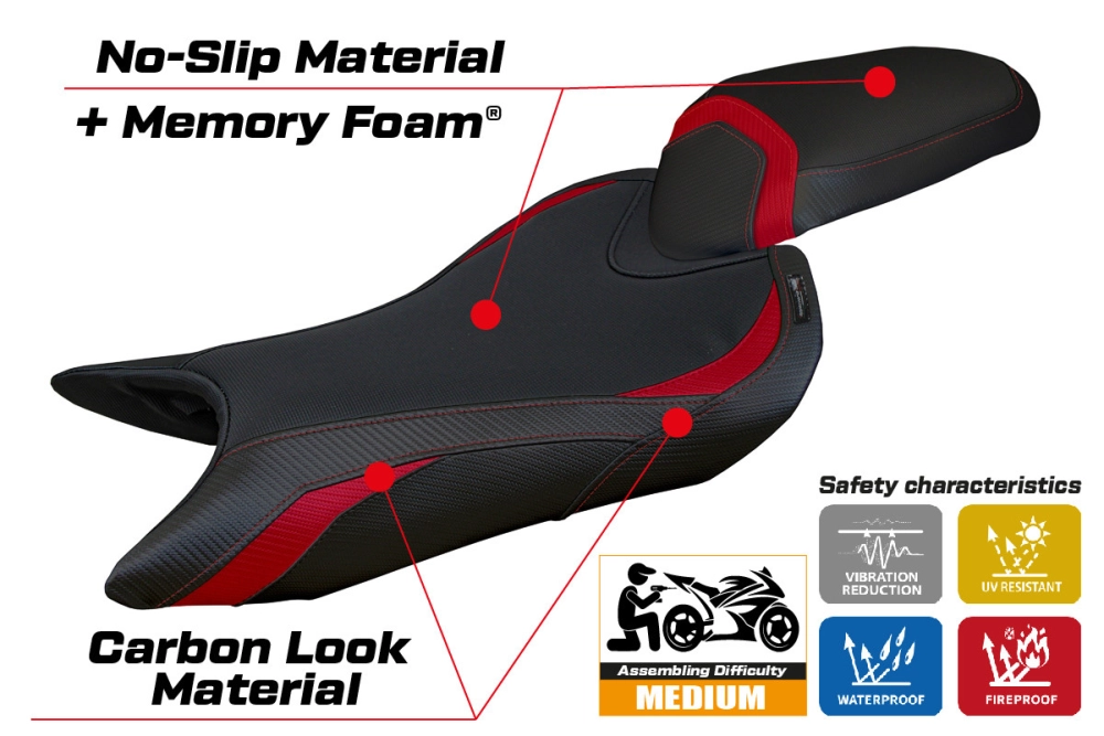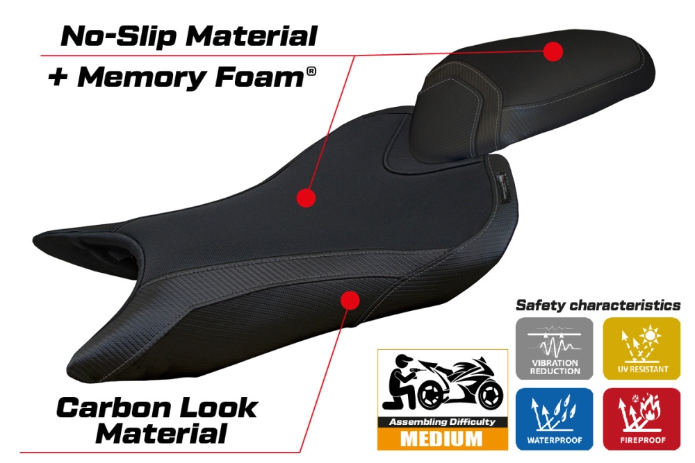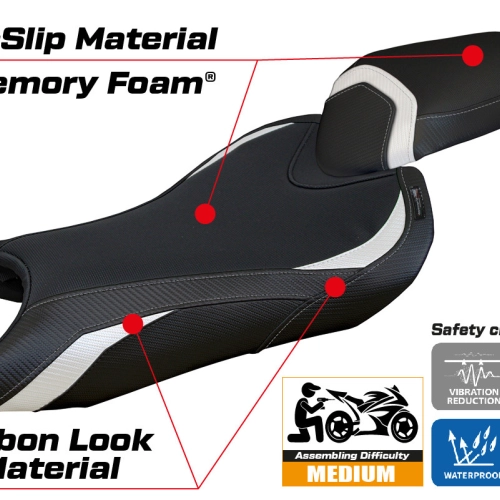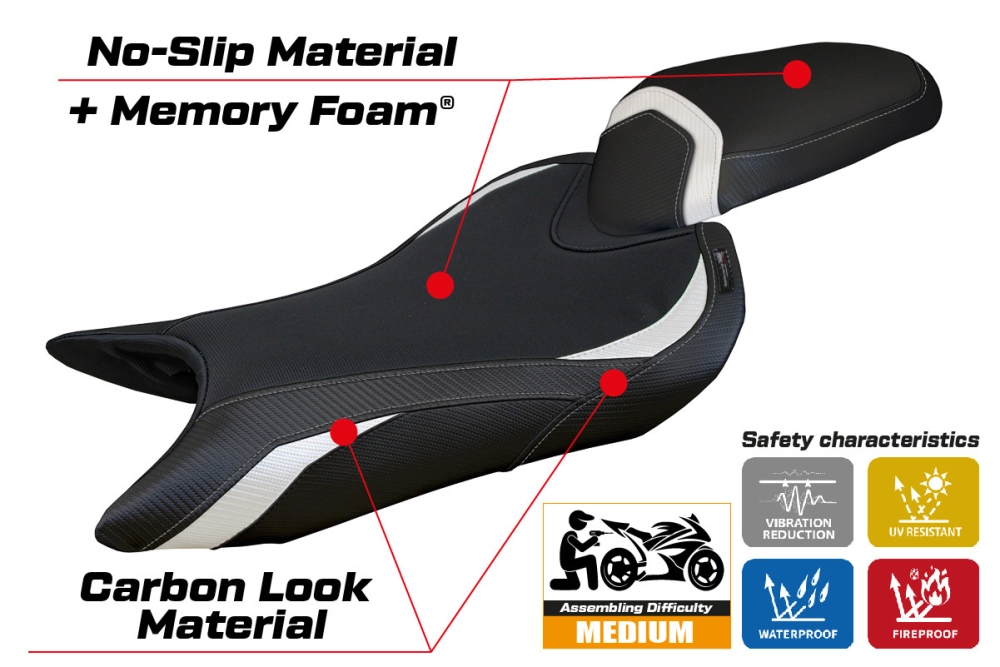 - Comfort system: Dieser Bezug ist außen exakt identisch mit allen anderen Bezügen, ist aber innen mit einer speziellen 2,5 cm dicken Schicht aus Memory-Schaumstoff gekoppelt. Tappezzeria Italia ist der einzige Hersteller, der die Memory Foam-Technologie verwendet, die den Fahrkomfort verbessert, indem sie Ermüdungserscheinungen und Vibrationen des Motorrads verringert.