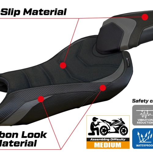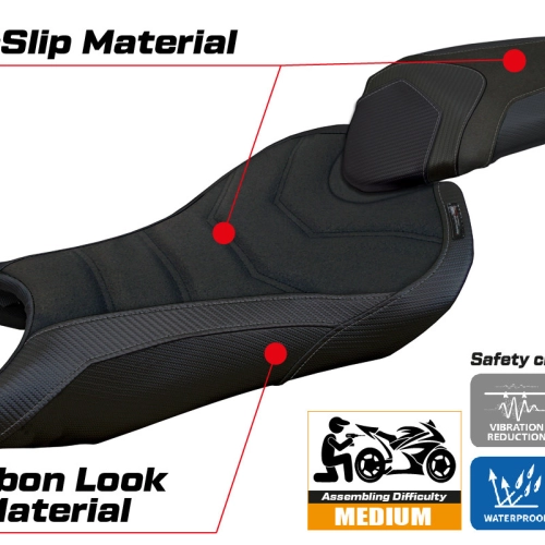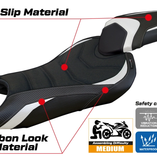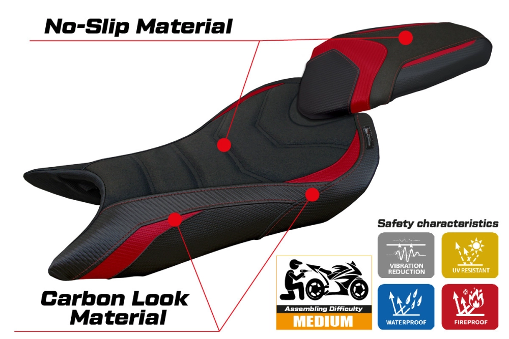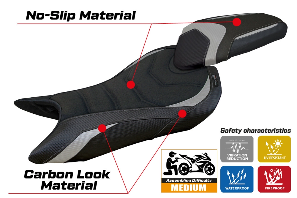 - Comfort system: Dieser Bezug ist außen exakt identisch mit allen anderen Bezügen, ist aber innen mit einer speziellen 2,5 cm dicken Schicht aus Memory-Schaumstoff gekoppelt. Tappezzeria Italia ist der einzige Hersteller, der die Memory Foam-Technologie verwendet, die den Fahrkomfort verbessert, indem sie Ermüdungserscheinungen und Vibrationen des Motorrads verringert.