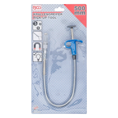 Flexible Pinzette und Magnet-Lampe 500 mm, ein ultrapraktisches 3-in-1-Werkzeug für Ihre Arbeiten in schwer zugänglichen Bereichen. Ausgestattet mit einem Krallenfinger, einer magnetischen Hebevorrichtung und einer integrierten Lampe an der Spitze.