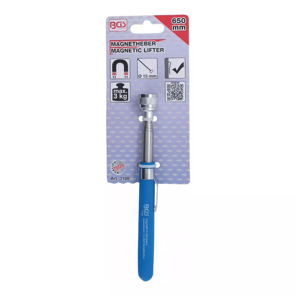Lasthebemagnet 650 mm BGS mit Schutzhülle, perfekt zum Bergen von Schrauben, Unterlegscheiben und Metallteilen an schwer zugänglichen Stellen. Magnetkopf Ø 15 mm, Zugkraft 3 kg, rutschfester Gummigriff mit integriertem Cliphalter.
