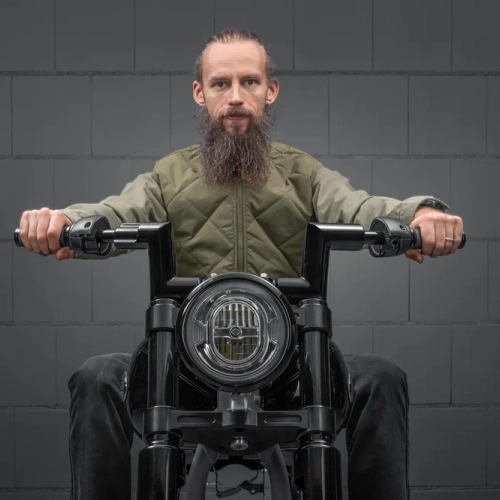 Klaudijus ist der Typ aus dem Norden, der sich durch den Bau preisgekrönter Harleys ab Anfang 2000 einen Namen gemacht hat. Er umgab sich mit den Besten auf seinem Gebiet: Laurynas, der Motorspezialist, Donatas, der Rahmenspezialist, Aurimas, der Elektriker, Viktor, der Produktingenieur, Vacys, der Ehemalige und Mentor des Teams.