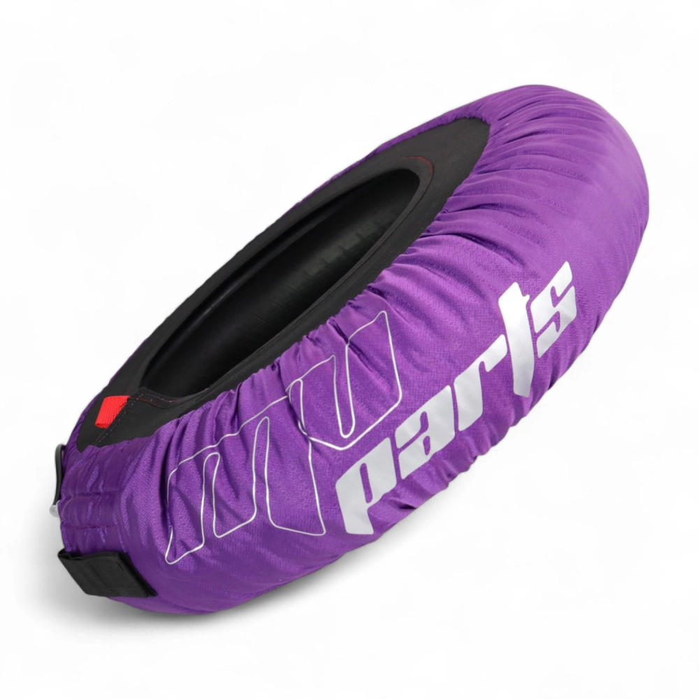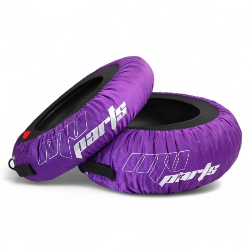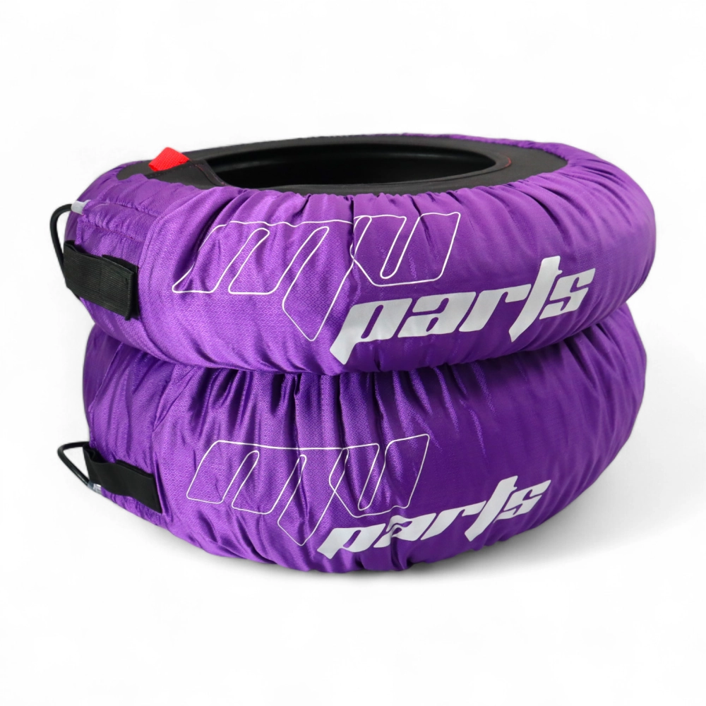 Paar maßgefertigter Reifenwärmer von MV Parts, entwickelt für eine gleichmäßige und kontrollierte Erwärmung Ihrer Motorradreifen dank eines automatischen Thermoregulationssystems bis zu 80 °C.