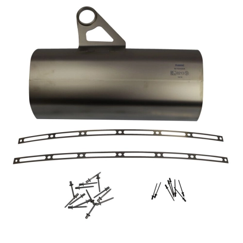 Schalldämpfer-Foliensatz. Ermöglicht den Austausch verlorener oder beschädigter Auspuffteile. Der Folienreparatursatz enthält eine Außenfolie, Klebebänder, Nieten und Aufkleber.