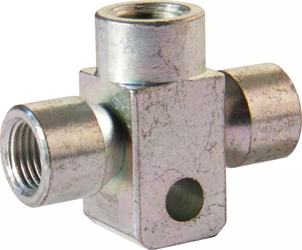 3-Wege-Stahlkupplung mit Innengewinde M10x100. Ideal zum Aufbau oder zur Reparatur von Motorrad-Brems- und Hydrauliksystemen. Robust und präzise, sorgt sie für perfekte Abdichtung und optimale Druckverteilung.