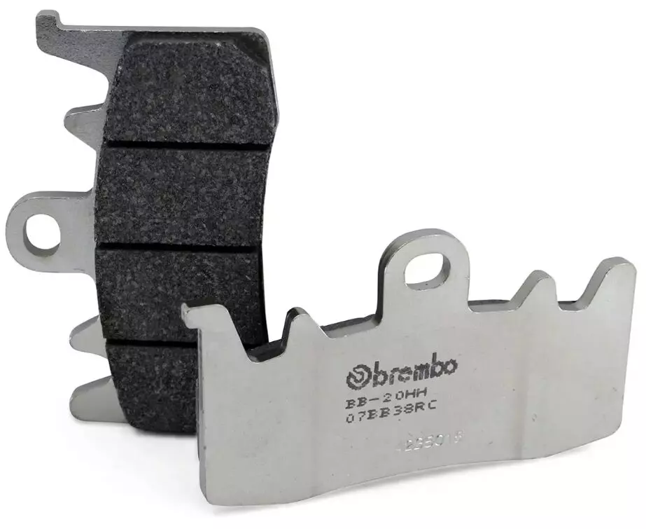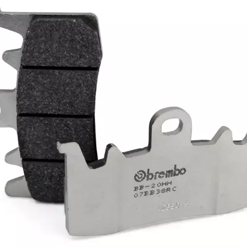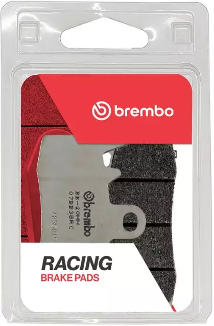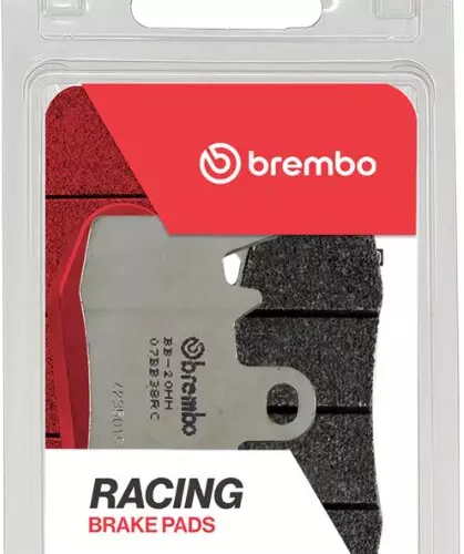 Erkennbar an ihrer grauen Trägerplatte sind die Brembo RC Carbon Ceramic Racing Bremsbeläge für den Einsatz auf der Rennstrecke konzipiert. Sie gewährleisten einen hohen Reibungskoeffizienten und eine stabile Leistung bei hohen Temperaturen.