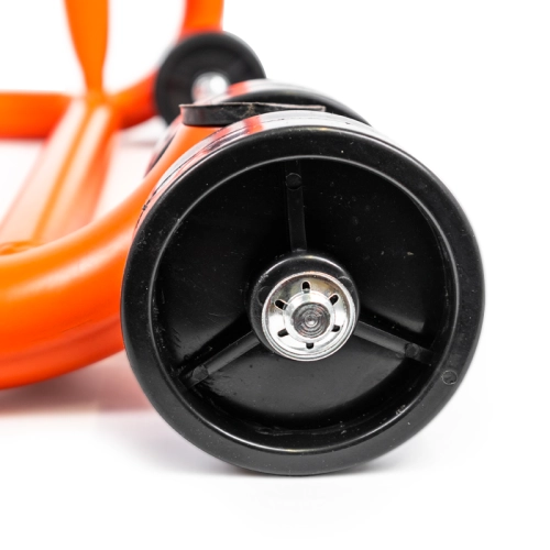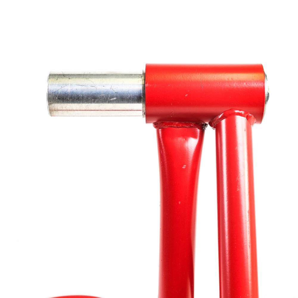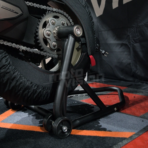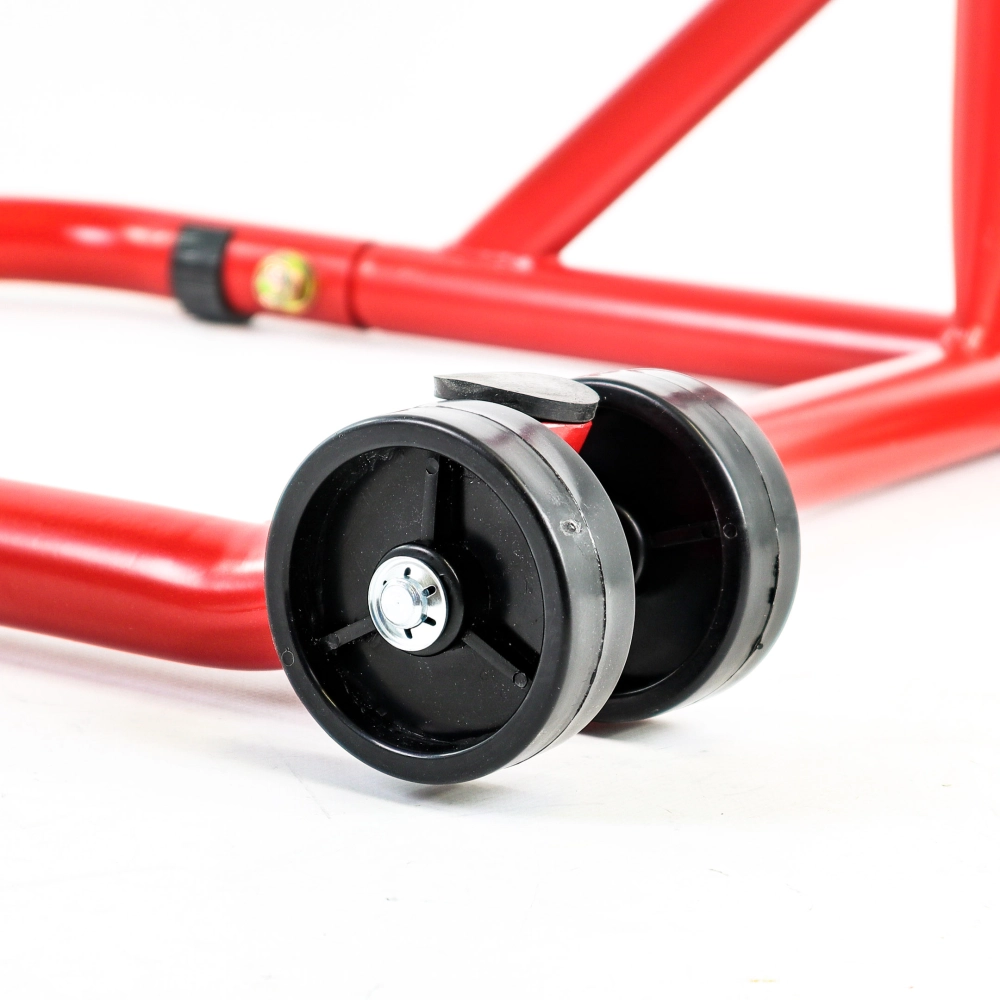 Der Einarmständer hat ein Rohr mit einem Durchmesser von 32 mm. Er ist leicht, wiegt nur 7 kg, hat einen Gummischutz an der Unterseite, vier Hart-PVC-Rollen für perfekte Stabilität und die richtige Halterung für Ihr Motorrad (Einarmschwinge).