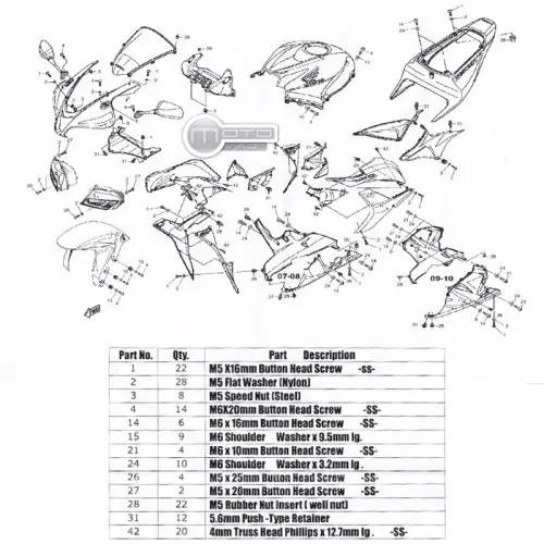 The kit contains all the screws, nuts, washers, locknuts, rivets, plastic clips, etc. required to fit an ABS fairing identical to the original.