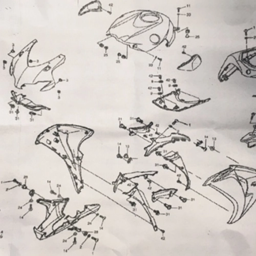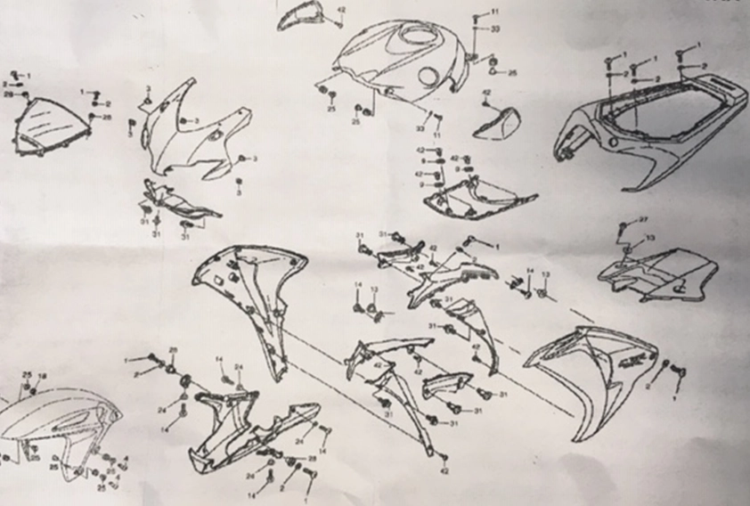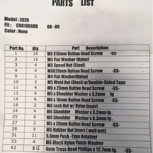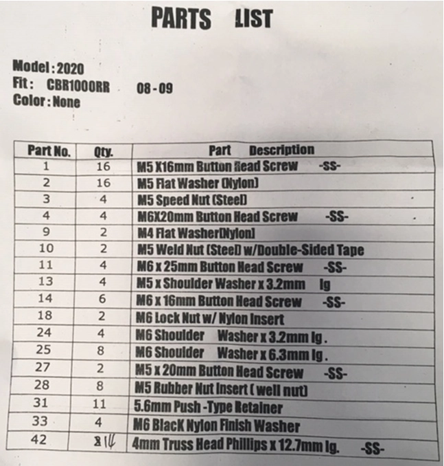 The kit contains all the screws, nuts, washers, locknuts, rivets, plastic clips, etc. required to fit an ABS fairing identical to the original.