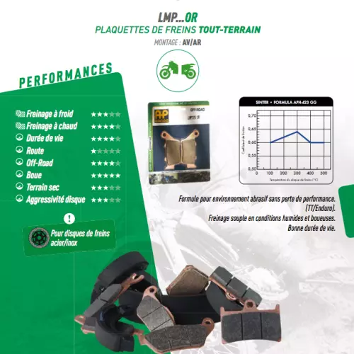 The AP Racing LMP OR range of motorbike brake pads is recommended for off-road use to maintain reliable braking performance in abrasive environments. Good longevity in difficult conditions (mud, greasy ground) and smooth braking in wet and muddy conditions.