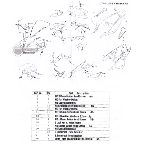 Genuine Yamaha R1 2007-2008fairing bolt kit contents