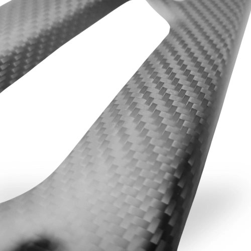 Easily recognisable by its very fine, tight weave, which makes it highly resistant to impact. The film is then placed in a mould with thermosetting polymer resin. As it dries, the carbon takes on its final shape, producing an aesthetic effect that is highly appreciated for its oblique lines.