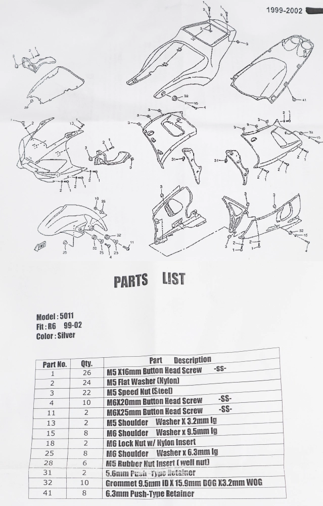 Genuine Yamaha R6 1999-2002fairing bolt kit contents