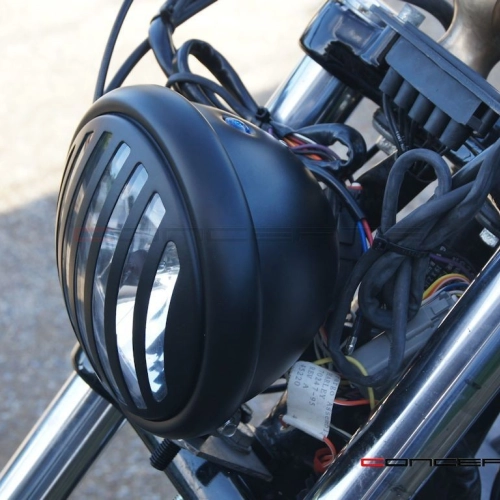 This universal Prison Grill Headlight is made of metal and has a matte black finish. It has a universal bottom mount which can be mounted to just about any motorcycle.
