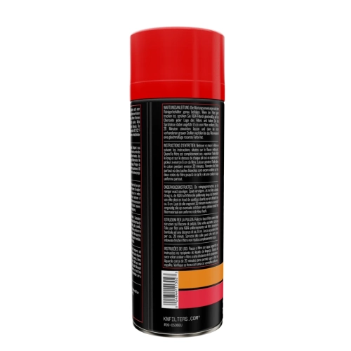 K&N Air Filter Oil 99-0504EU is labeled in German, French, Dutch, Italian and Portuguese for use in Europe.
