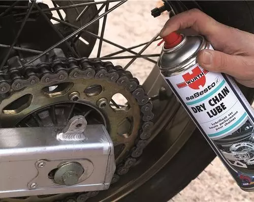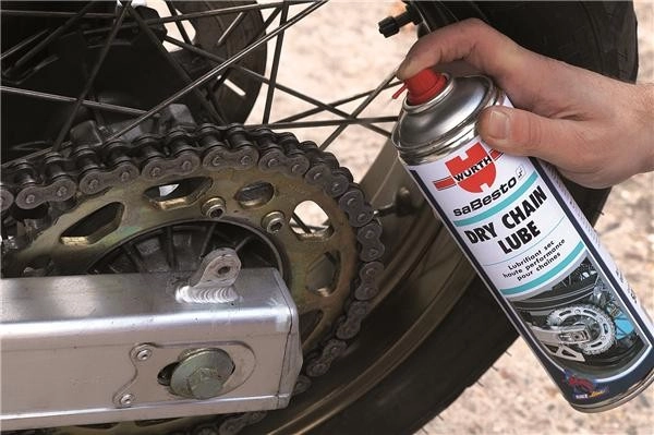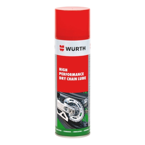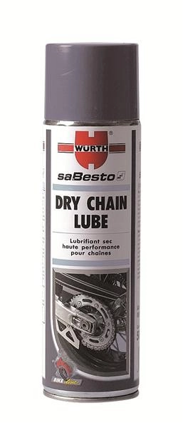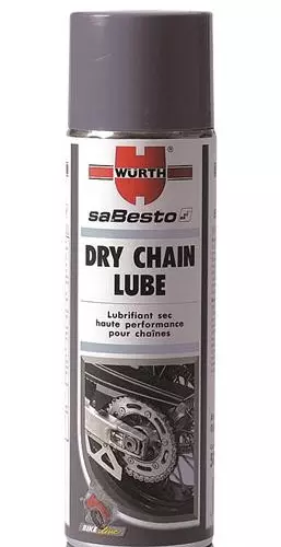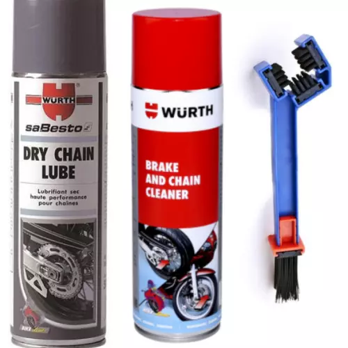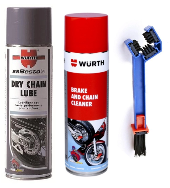 Maintenance pack for chains including a brake and chain cleaner Würth 500ml, a dry chain lubricant Würth 500ml and a chain brush.