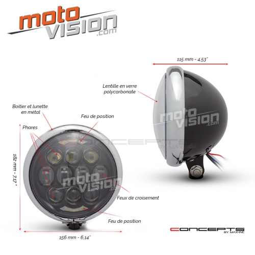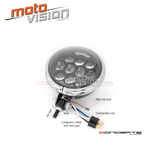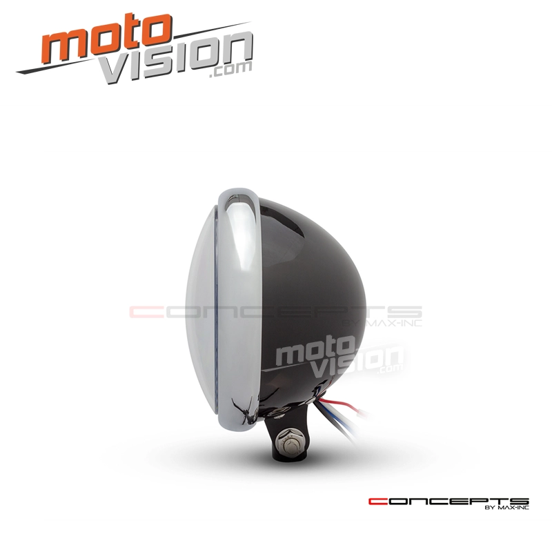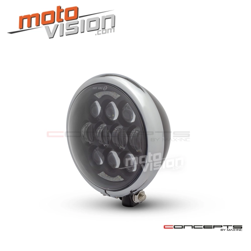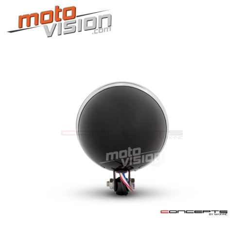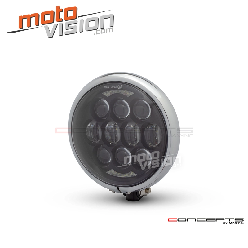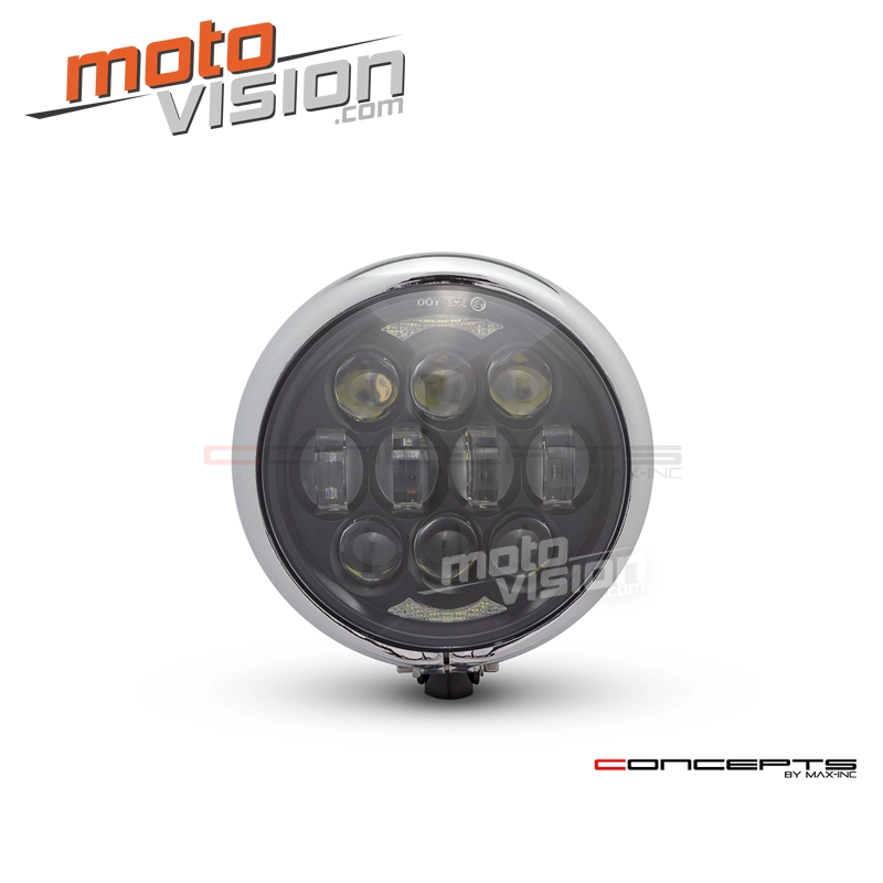 This Universal Headlight combines a Classic Bates Style Metal Housing with a modern LED insert. It has a universal bottom mount which can be mounted to just about any motorcycle. Super bright and super cool.