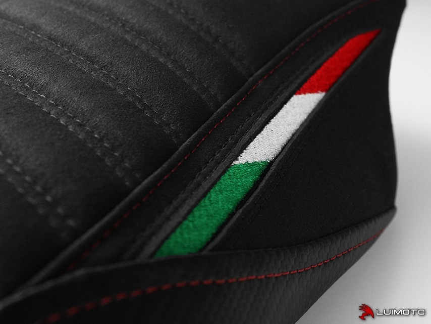 High quality Luimoto Seat cover Couvre selle Corsa pour pilote Ducati Panigale V4 2018 made in Canada. The brand designs products with a superb finish: detailed embroidery, navy vinyl, carbon style fabric or high quality suede leather... The design and colours are customised to match the look of your bike.