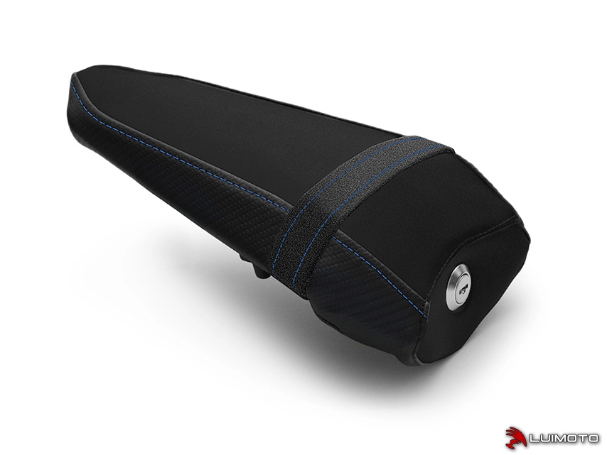 High quality Luimoto Seat cover Yamaha R6 17-18 Coutures Bleues made in Canada. The brand designs products with a superb finish: detailed embroidery, navy vinyl, carbon style fabric or high quality suede leather... The design and colours are customised to match the look of your bike.