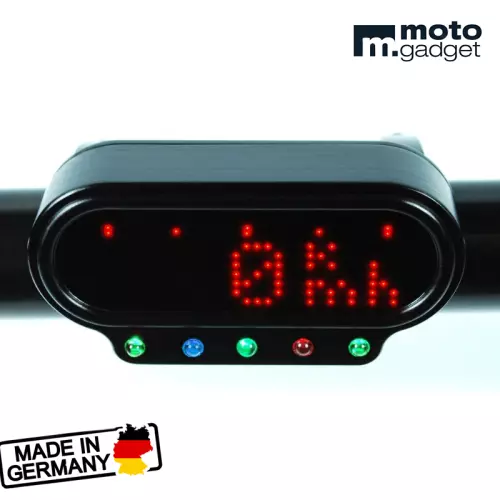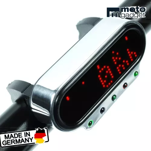 All products are developed and tested by motogadget in Berlin. The entire production and finishing process is carried out by a highly qualified team, largely by hand. The range of motorbike accessories includes analogue and digital multifunction instruments, electronic switches and controls, mirrors, indicators, instrument panels and much more.