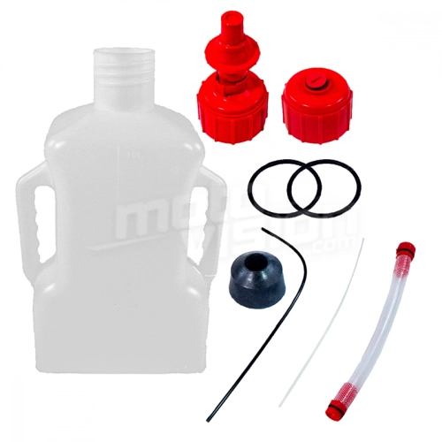 The pack includes a 20-litre canister, a spout with hose and a spout. It allows you to fill your tank without spilling fuel on the bike's tank, the ground or your clothes while you're turning the canister upside down. This can be particularly useful for bikers taking part in races where every second counts!